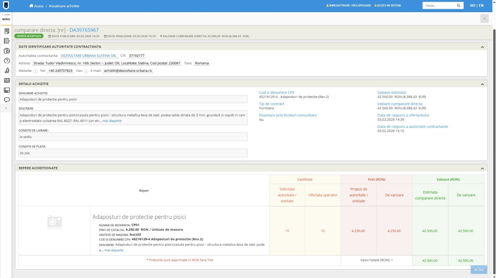 Potrivit datelor disponibile pe platforma SICAP, un singur adăpost felin a costat 4.250 de lei, Primăria cumpărând un prim lot de zece bucăți pe 28 ianuarie. La începutul acestei săptămâni, s-a mai cumpărat un lot de zece, ceea ce duce la un cost total de 8.500 de lei.