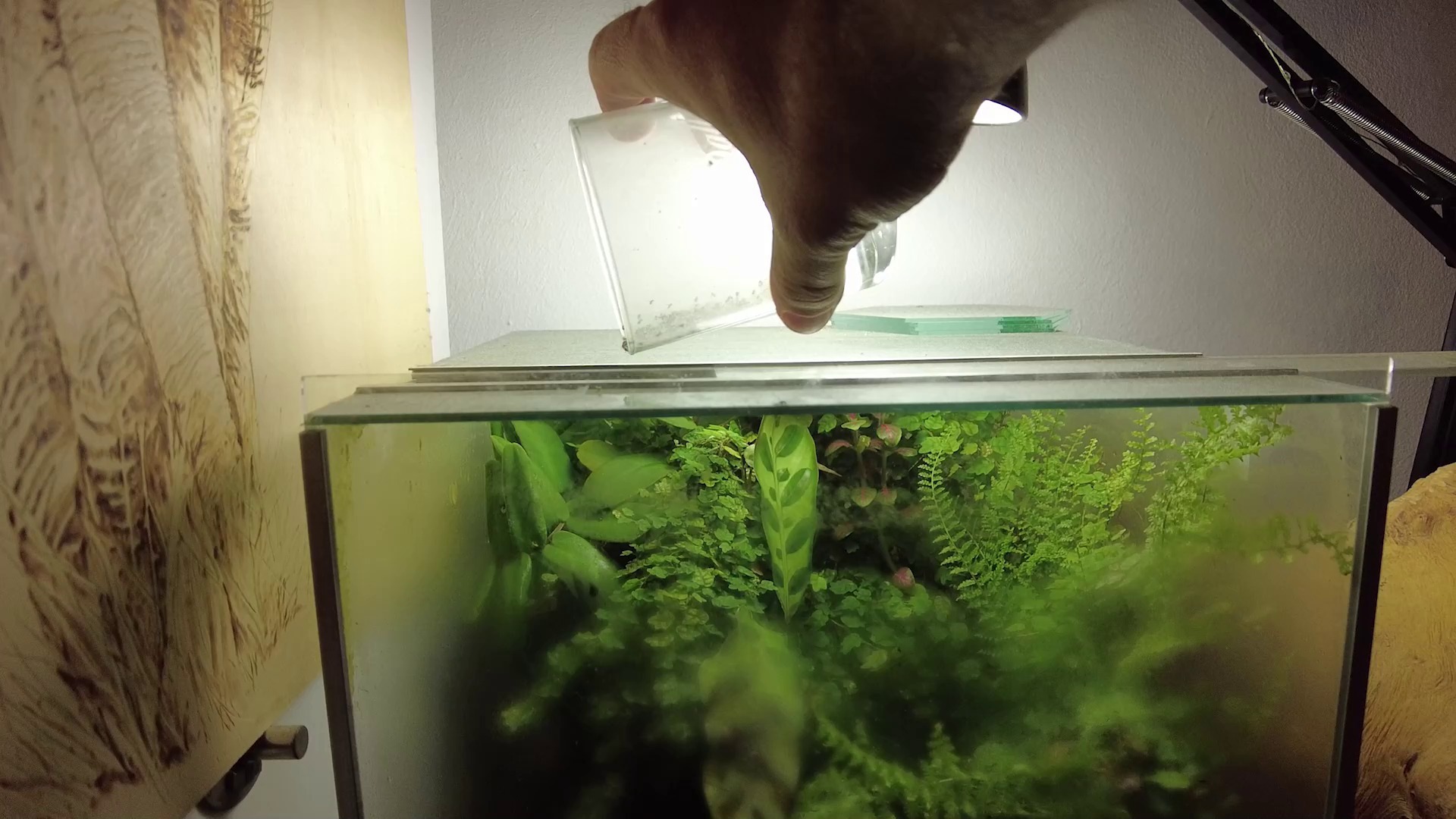 Vlad Rotaru: „Toată pasiunea mea cu aceste animăluțe a apărut cam acum 5-6 ani. Am început cu peștii. Mi-a fost facil să fac primul acvariu, exact acvariul de aici. Și am o pasiune pentru animăluțele mici, pentru plantele mici, pentru că mi se pare că pot să creez un ecosistem în miniatură, într-o incintă de sticlă. Dacă ar fi plante mari, îmi pare că nu ar fi la fel de estetic”.