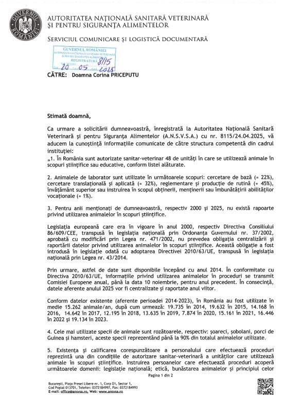 Răspuns ANSVSA: În baza legislației naționale privind autorizarea proiectelor care implică utilizarea animalelor în proceduri, acestea sunt evaluate inclusiv prin prisma estimării conformității cu cerințele privind înlocuirea, reducerea și îmbunătățirea utilizării animalelor în proceduri, precum și a analizei prejudiciu-beneficiu a proiectului, pentru a evalua dacă răul cauzat animalelor sub aspectul suferinței, durerii și a stresului este justificat de rezultatul scontat, ținând seama de considerente etice și dacă ar putea fi, în final, în beneficiul oamenilor, animalelor sau mediului.