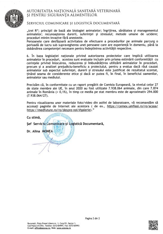 Precizăm că, în conformitate cu un raport pregătit de Comisia Europenă, la nivelul celor 27 de state membre ale UE, în anul 2020 au fost utilizate 7.938.064 animale, din care 7.874 animale din Romania (< 0,1%), în timp ce media pe stat membru este de aproxaimativ 294.000 (7.938.064 / 27).