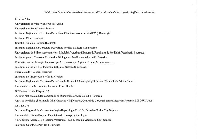 Răspuns ANSVSA: În România sunt autorizate sanitar-veterinar 48 de unități în care se utilizează animale în scopuri științifice sau educative, conform listei alăturate.