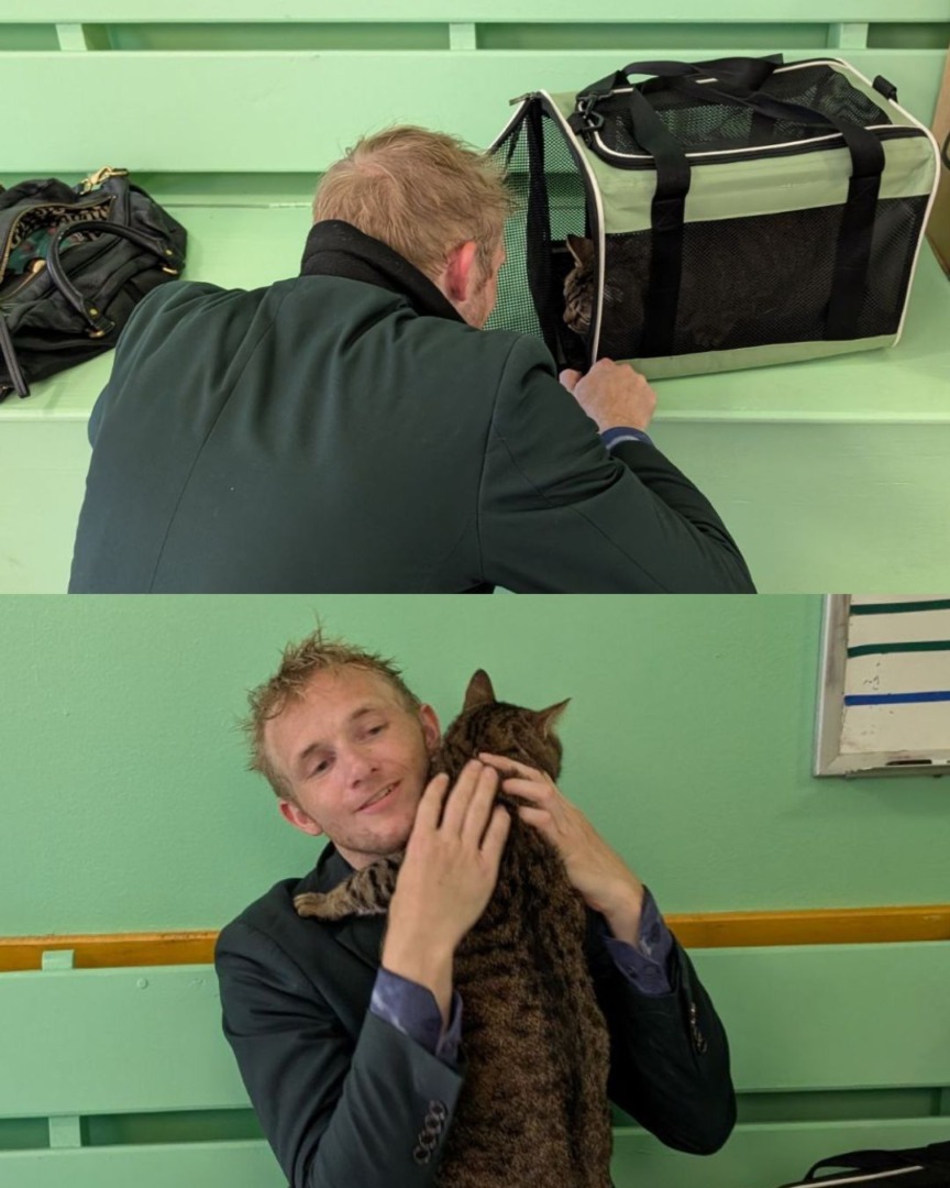 În urmă cu o săptămână, Jake a venit la centru pentru a verifica dacă Rocky se mai află în grija voluntarilor. Surpriza a fost una plăcută atunci când una dintre îngrijitoarele l-a adus la cușca în care fusese plasat. Jake și pisica lui au fost reuniți, iar bărbatul a putut să-și readucă prietenul blănos acasă.