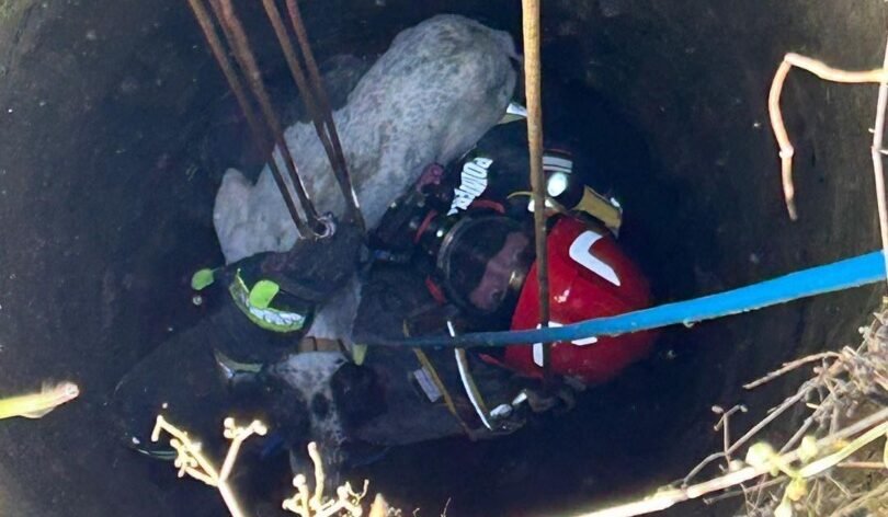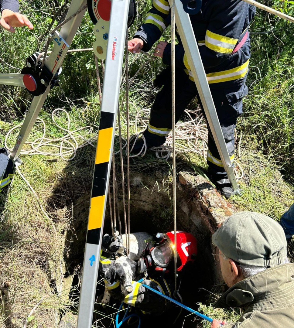 Incidentul s-a petrecut pe un câmp, la intrarea în localitate. Martorii au alertat autoritățile, iar pompierii au intervenit rapid pentru a extrage în siguranță animalul. Intervenția s-a încheiat cu succes, iar câinele a fost predat teafăr stăpânului său, aflat la fața locului.