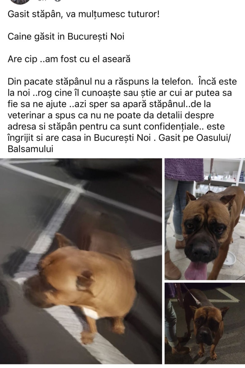 „În fine, degeaba au microcip dacă nu primești detaliile de care este nevoie. Nu mi-au oferit nicio recompensă și nici nu am așteptat una. M-am bucurat pur și simplu că a ajuns din nou acasă.. L-am găsit pe stradă și l-am dus la veterinar, însă stăpânul nu a răspuns la telefon. Pentru că urma focul de artificii și nu știam cum va reacționa, am decis să îl iau temporar la mine acasă. La cabinetul veterinar nu s-au putut face alte demersuri, întrucât personalul nu avea voie să îmi ofere datele proprietarului, ci doar să îl contacteze. Dimineața, am reluat căutările, iar ulterior proprietarul mi-a scris pe Messenger. Câinele, de talie mare, sărise poarta înainte de ora 00:00, probabil speriat de zgomot. Stăpânii au venit și l-au recuperat după ce au văzut postările de pe pagina de Facebook «Câini pierduți»”, ne-a povestit Ramona Olteanu, persoana care a găsit un Cane Corso pe stradă.