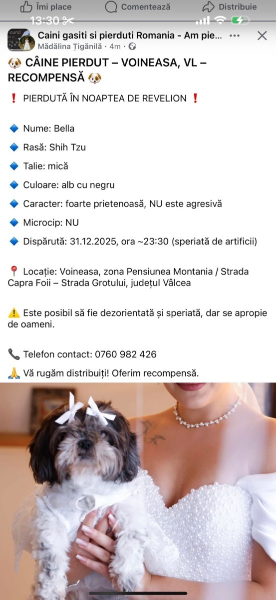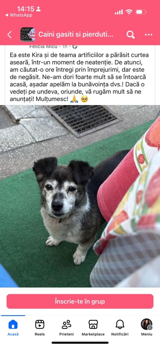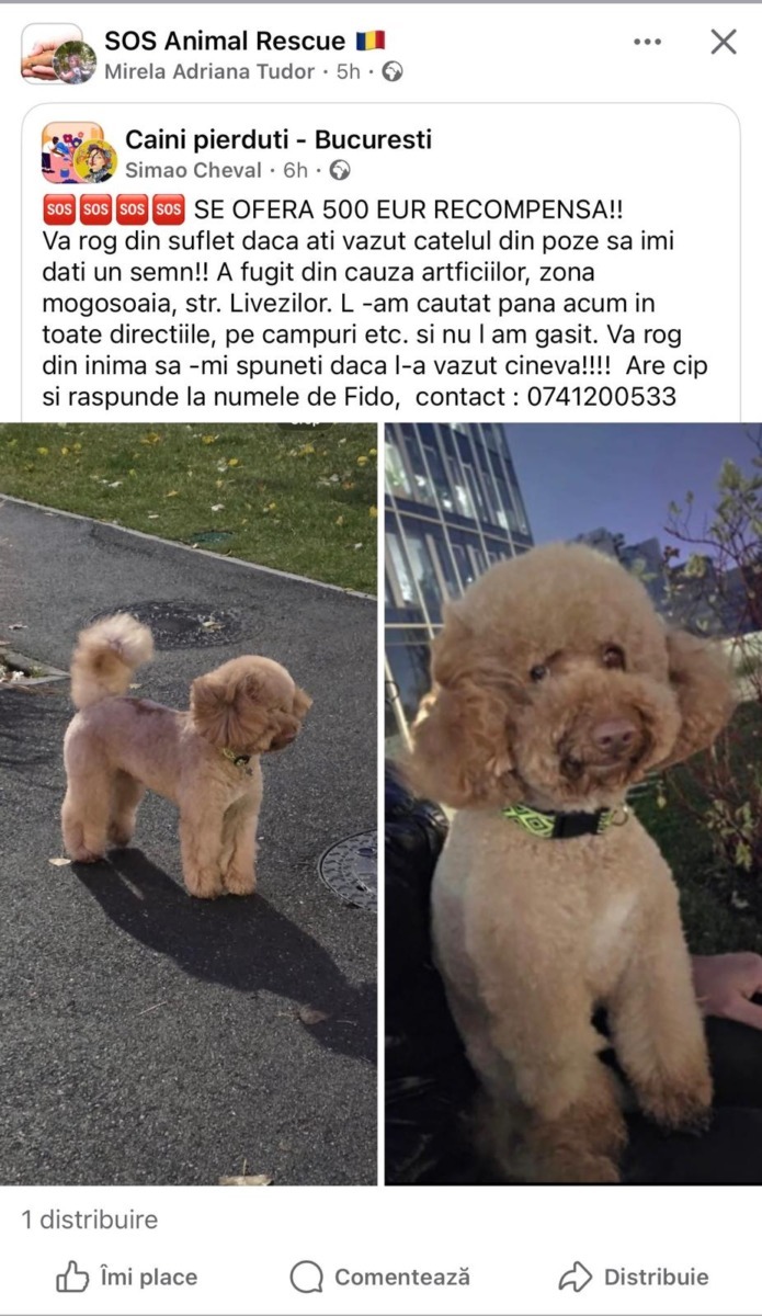 „Eram de Revelion la niște prieteni care locuiesc în Mogoșoaia. La miezul nopții, aceștia au vrut să iasă cu copiii, iar câinele, care se afla în casă, s-a strecurat printre ei. În momentul în care a ajuns în curte și a auzit zgomotul artificiilor, s-a speriat foarte tare și a fugit spre străzi și câmp.