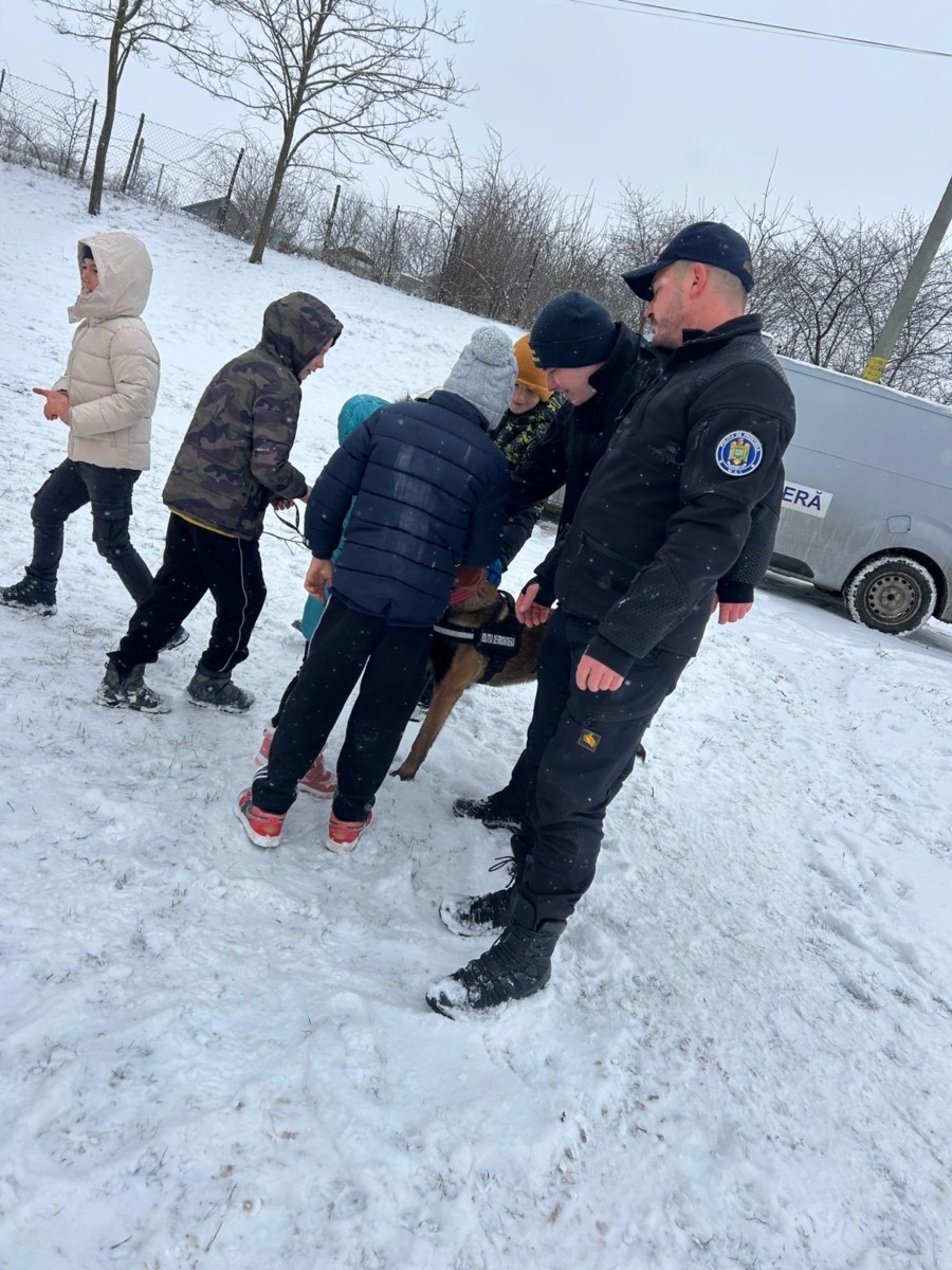 Curtea școlii s-a transformat pentru câteva ore într-un mic poligon de antrenament, iar două cupluri chinologice au devenit „profesorii” copiilor. Nu a fost doar despre exerciții sau demonstrații de agilitate: misiunea a fost să arate celor mici cât de loiali și inteligenți sunt câinii de serviciu.