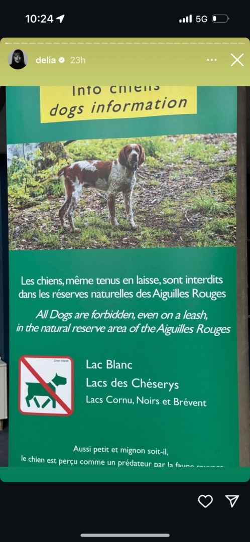 Artista Delia Matache a atras atenția fanilor pe Instagram asupra unui aspect mai puțin cunoscut de turiști: în rezervația naturală Aiguilles Rouges din Alpii francezi, un panou indică foarte clar faptul că accesul câinilor este interzis, chiar și atunci când sunt ținuți în lesă.
