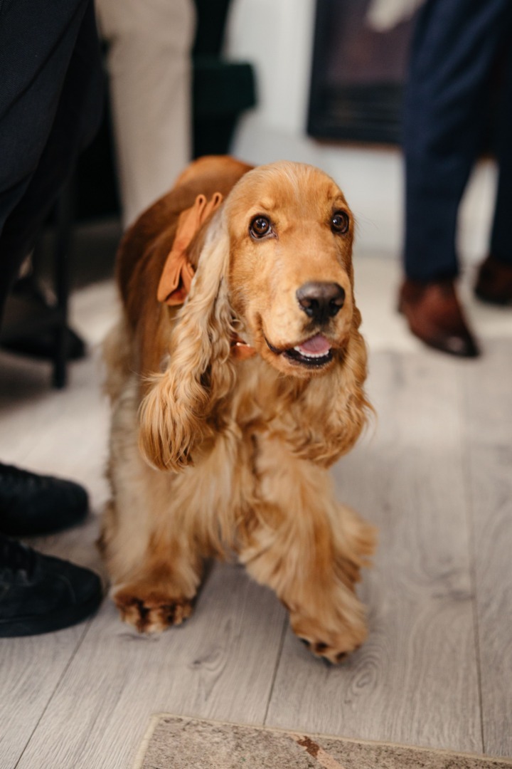 Simpaticul Enzo, un cocker spaniel englez, nu numai că a fost la nunta părinților lui, dar a și primit titlul de cavaler de onoare. Îmbrăcat cu un frac comod, Enzo parcă a simțit că a fost martorul unui moment important.