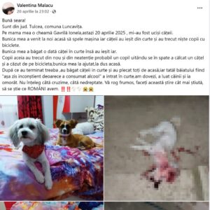 „Sunt din jud. Tulcea, comuna Luncavița (…) Astăzi, 20 aprilie 2025, mi-au fost uciși cățeii, Emma și Alma. Bunica mea a venit la noi acasă să spele mașina, iar cățeii au ieșit din curte și au trecut niște copii cu biciclete. Bunica mea a băgat o dată cățeii în curte, însă au ieșit iar. Copiii aceia au trecut din nou și, din neatenție probabil, un copil, uitându-se în spate, a călcat un cățel și a căzut de pe bicicletă. Bunica mea l-a ajutat, l-a dus acasă.