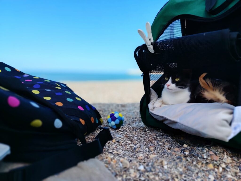 Reacții de pisică la mare: Curiozitate, joacă și pauze în rucsac