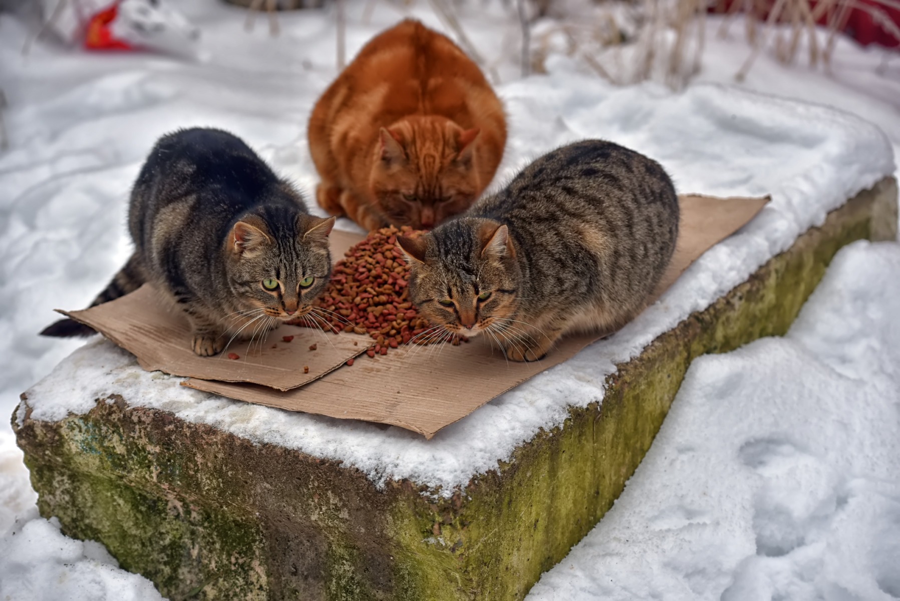 Pentru a le oferi un adăpost pe timp de iarnă, cel mai indicată este confecționarea unor căsuțe din carton sau plastic gros, ridicate pe cărămizi sau paleți de la sol. Înăuntru nu trebuie puse textile, căci acestea se udă mai rapid și îngheață. Cele mai recomandate sunt paiele, care nu îngheață, însă trebuie schimbate des.