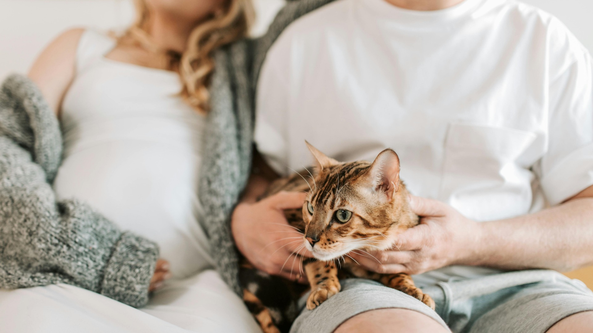 Cuplu cu o femeie însărcinată și un bărbat care ține o pisică pe genunchi. Sursa foto: Pexels