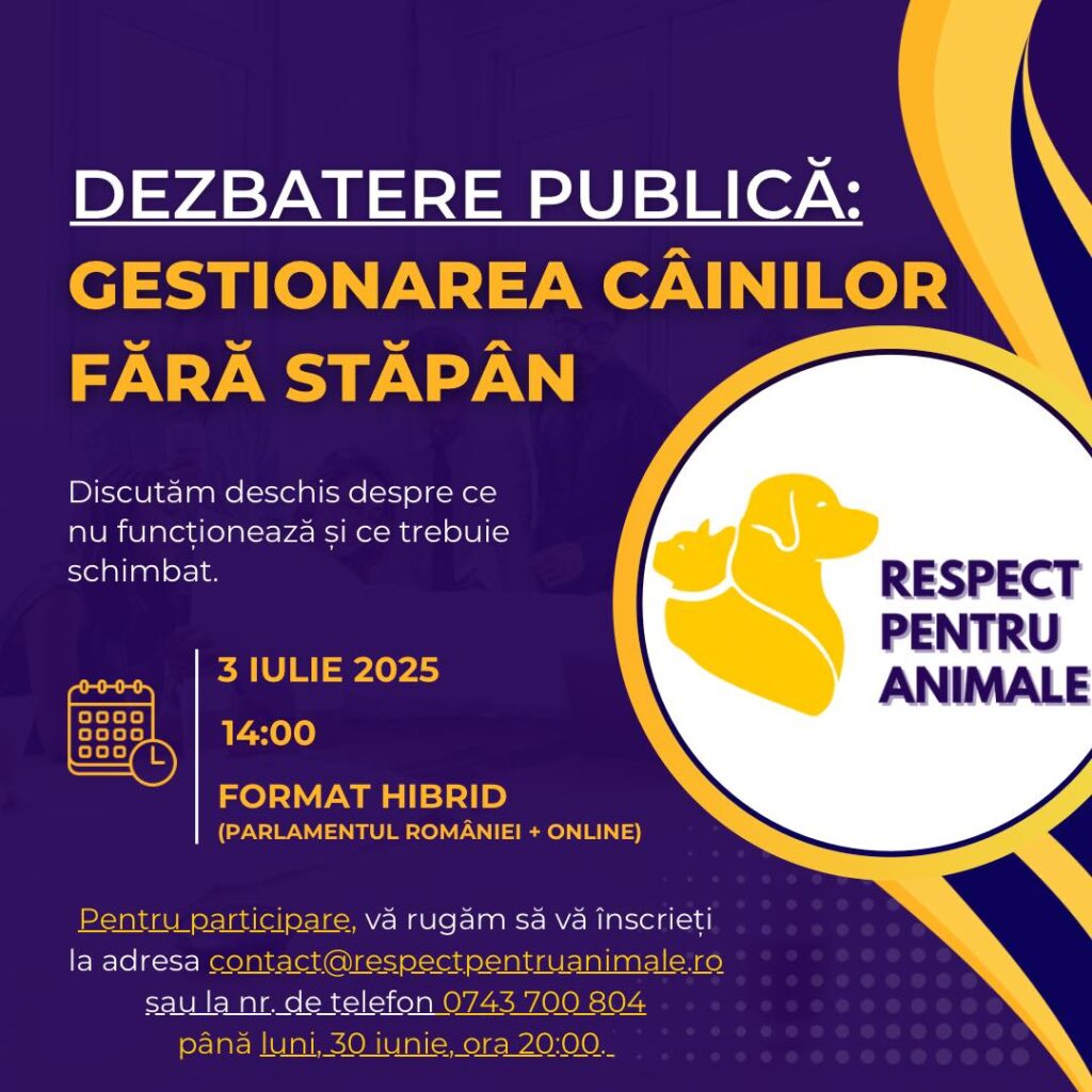 Pentru că nu e vorba doar despre câinii fără stăpân. Este despre cum vrem să construim o societate responsabilă, despre siguranță, empatie și bun-simț comunitar. Dezbaterea își propune să strângă idei, propuneri și soluții pe baza cărora se va realiza în toamnă Decalogul pentru protecția animalelor, un plan național de măsuri concrete.
