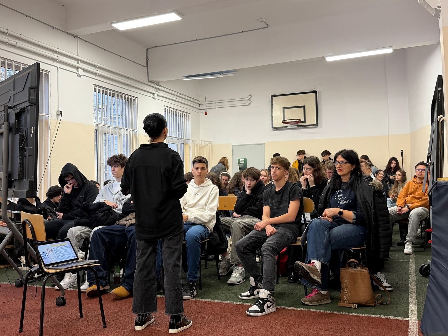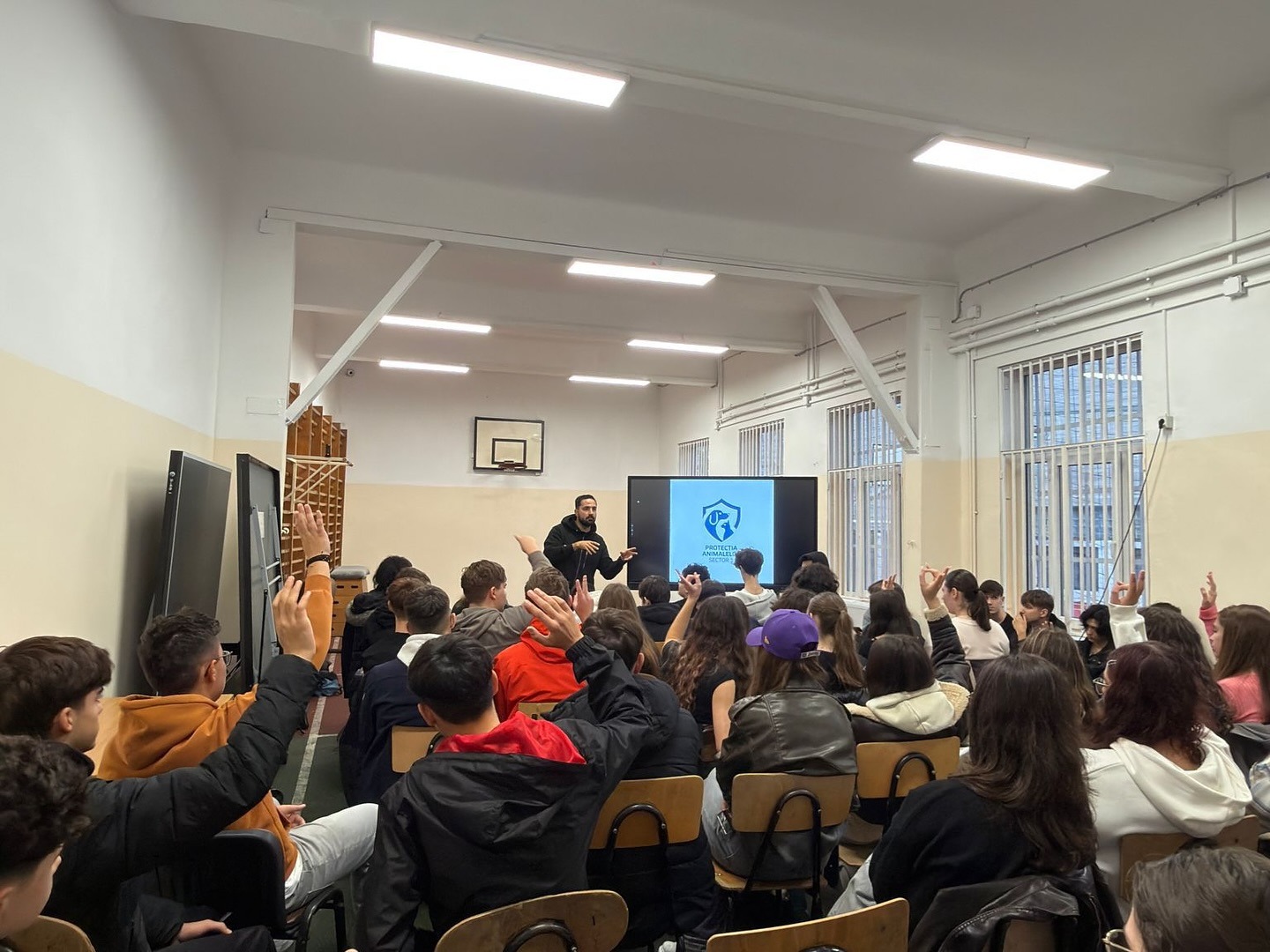 Tudor Tim Ionescu vorbește cu elevii unui liceu din Sectorul 1 despre respectul față de animale Sursa foto: Protecția Animalelor Sector 1