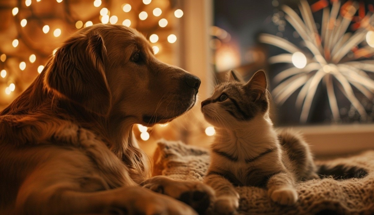 Focurile de artificii sunt o sursă comună de anxietate la pisici și câini. Zgomotele puternice sunt înspăimântătoare și copleșitoare pentru companionii noștri blănoși. Totuși, animalele de companie pot fi stresate și de decorațiunile nefamiliare, muzica tare, oaspeții gălăgioși, ciocnirea cupelor de șampanie.