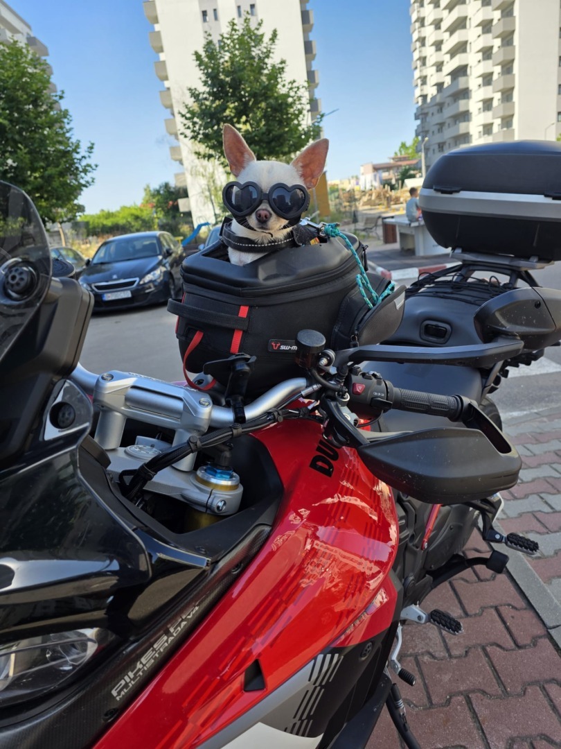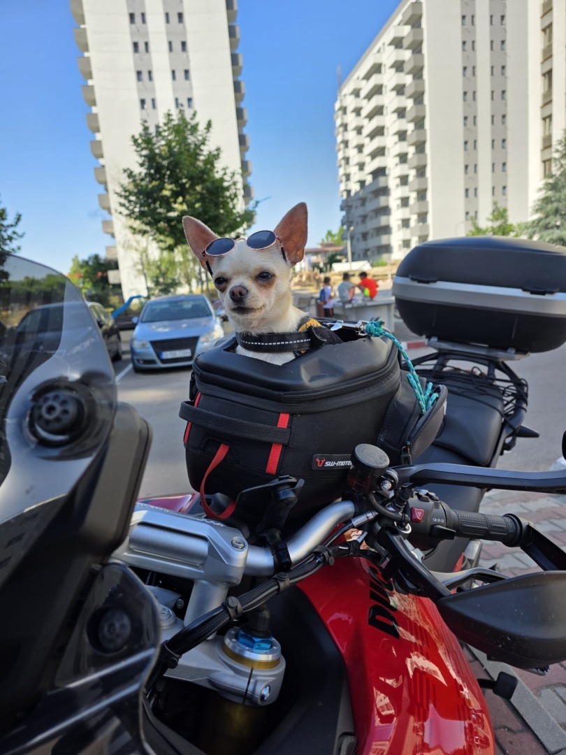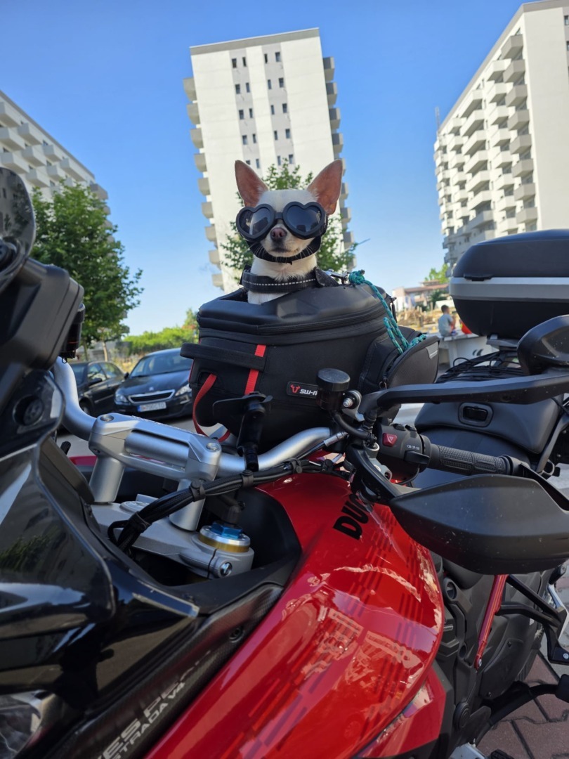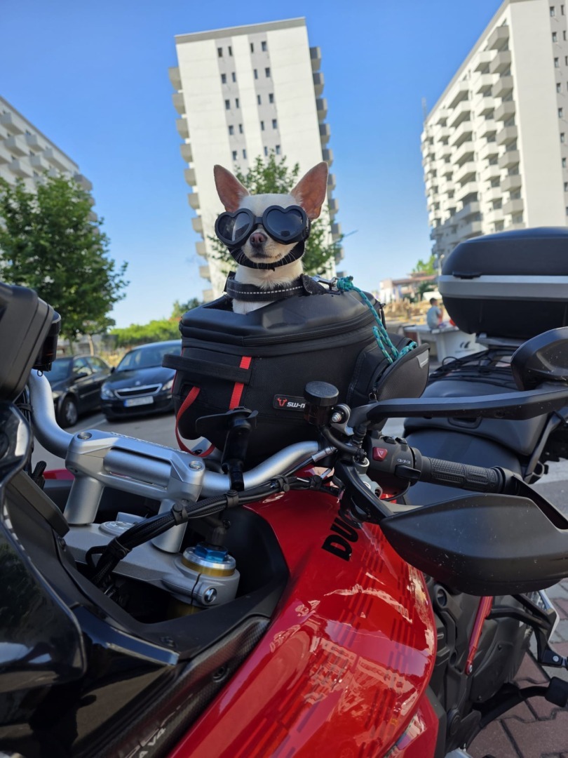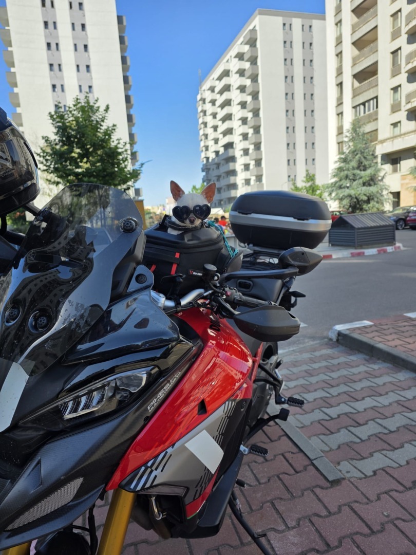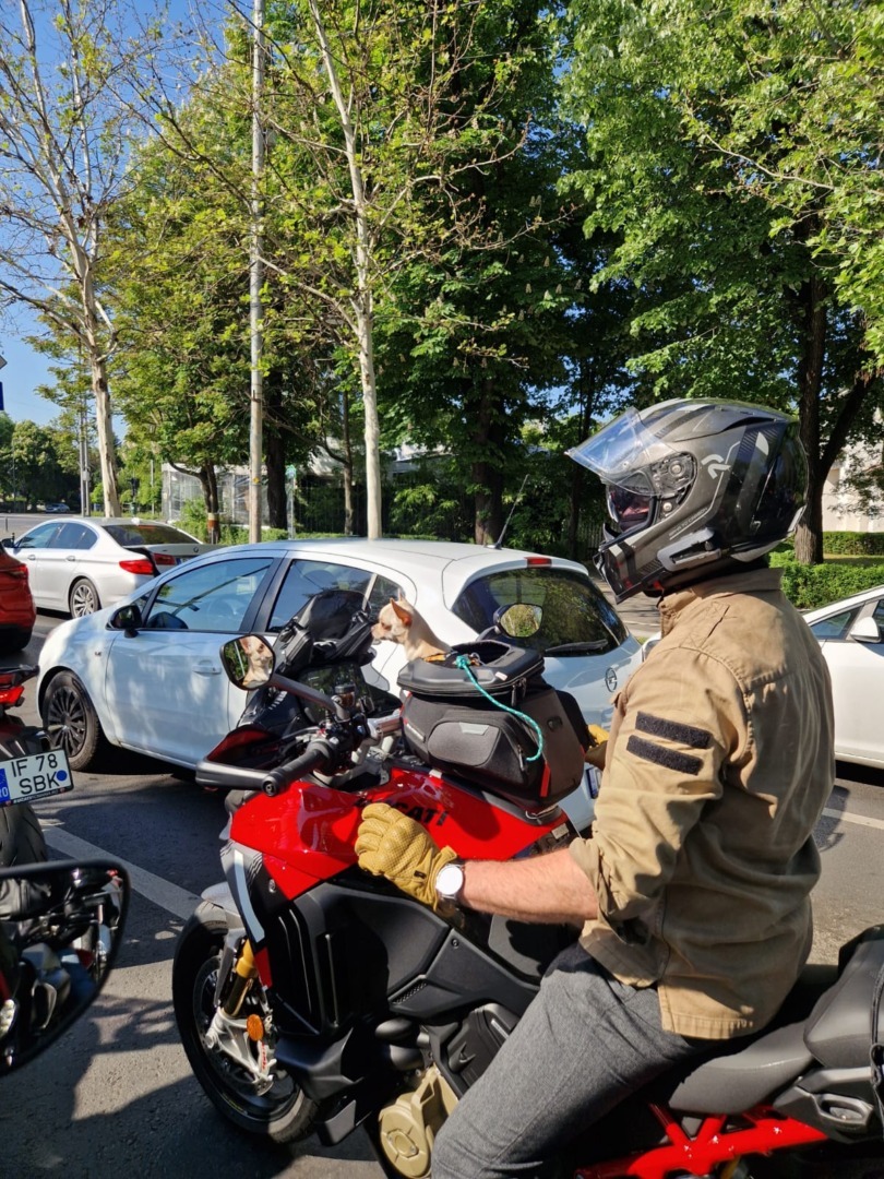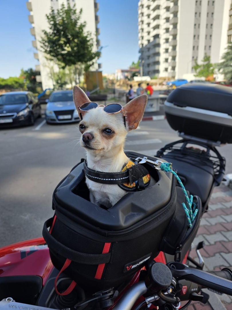 Alexandru Buzdea: Nu am văzut direct, dar știu că mai sunt. Există rucsacuri și suporturi speciale, însă cele mai multe se montează în spatele motocicletei și pot fi folosite și pentru câini mai mari. Sunt ca niște cutii speciale care se fixează în spate.