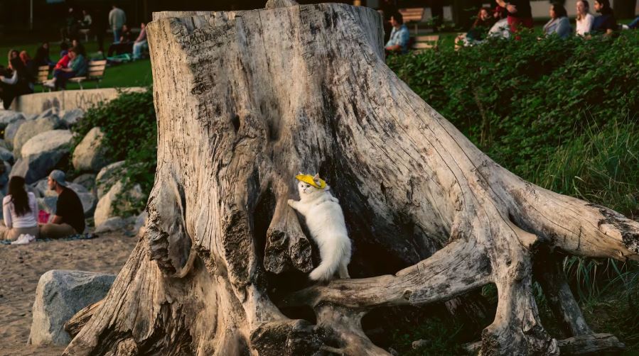 Pe un ciot înalt de copac, pe țărmul English Bay Beach (Vancouver), ocupată de turiști, se află un ghem de blană alb și pufos, care poartă pe cap o pălărie galbenă. Motivul pentru care Mittens nu reacționează la gălăgia din jurul ei este că nu aude nimic din ceea ce se întâmplă, notează CTV news.
