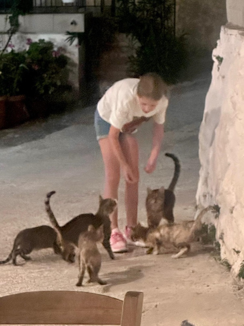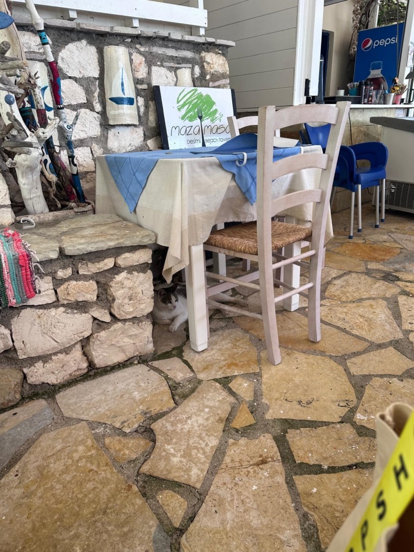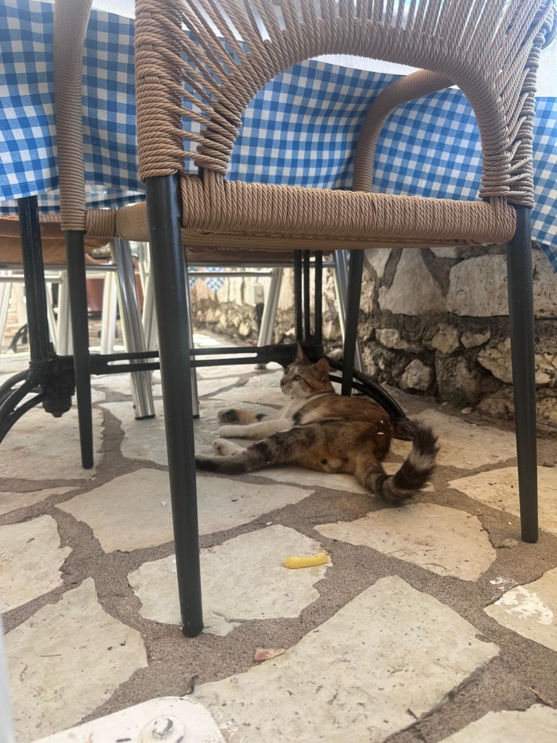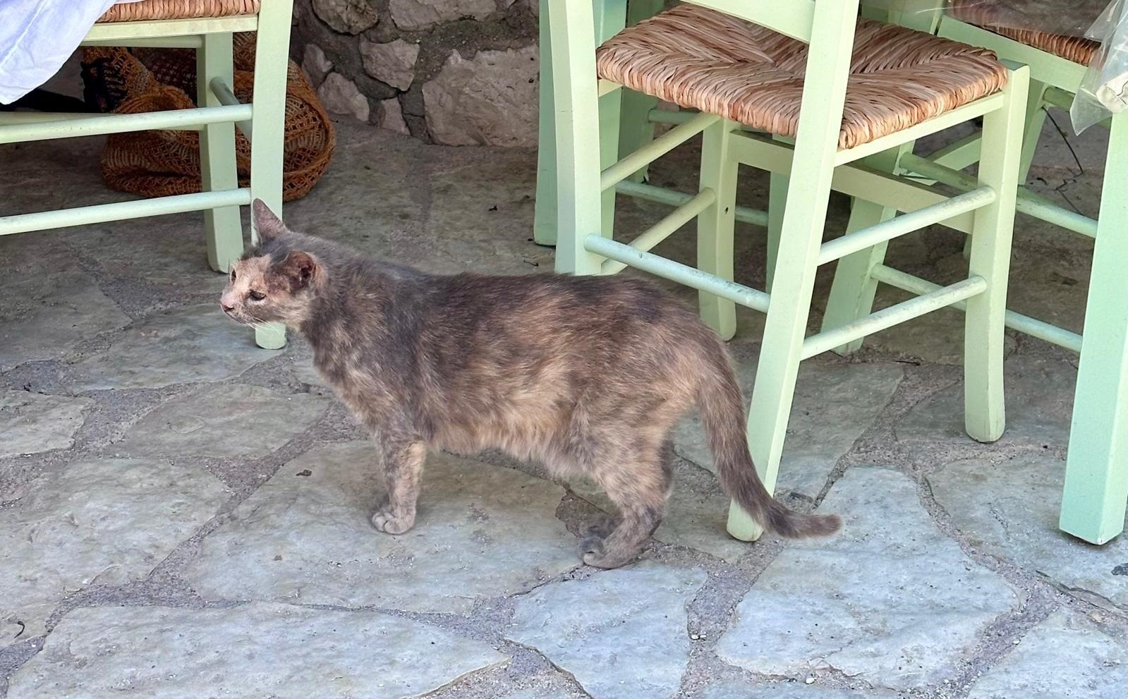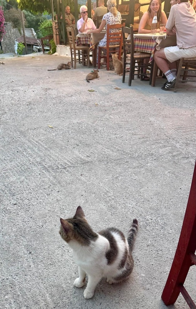 Se gudură, miaună și așteaptă nemișcate minute întregi pentru a-i vrăji pe meseni să arunce o bucățică, cât de mică. Și puțini sunt cei care nu se lasă convinși. Iar odată ce festinul a început, de unde, de neunde, apar surorile și frații câștigătoarei, care încep o adevărată misiune de prindere din zbor a bucatelor alese. Turiștii sunt obișnuiți deja după prima cină pe insulă și parcă atunci când comandă le iau și pe feline în calcul.