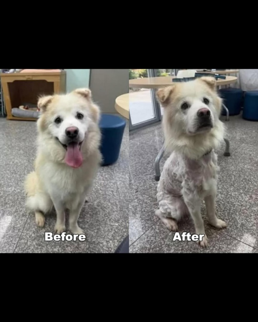 FOTO | Juno, câinele care a fost adoptat și returnat în aceeași zi la adăpost cu blana tunsă