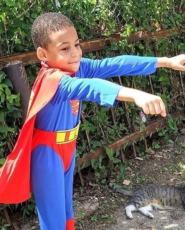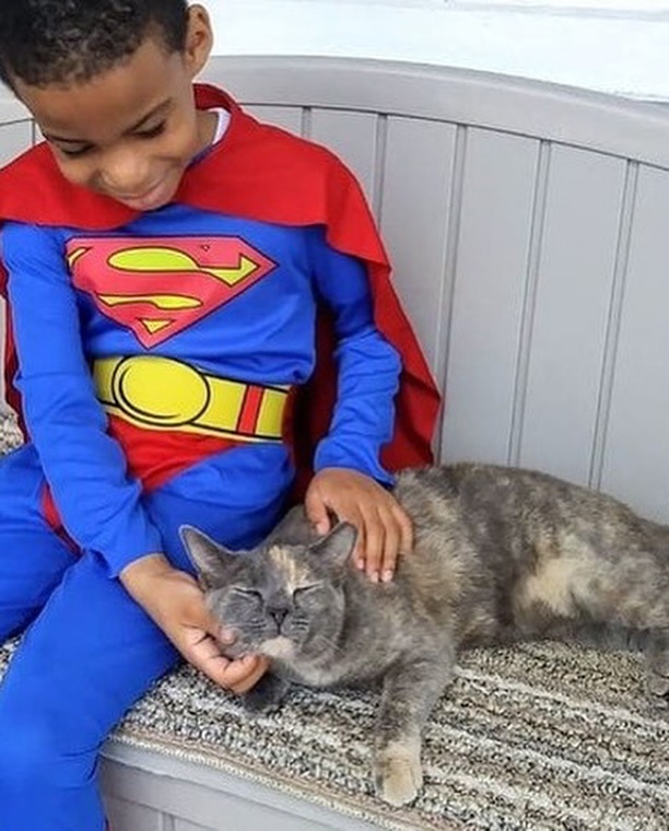 Un copil îmbrăcat în costumul lui Superman, alături de o pisică neagră Sursa foto: Instagram