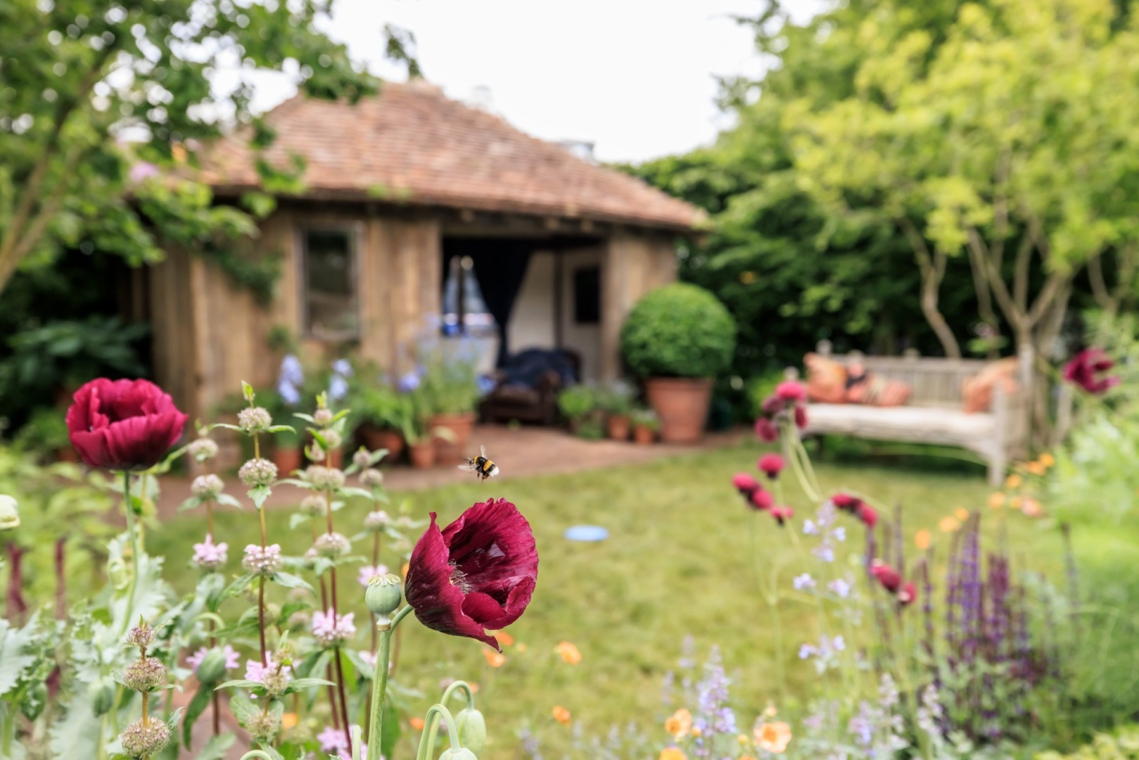 „Am vrut să fac o grădină simplă, fără mesaje ascunse, doar un loc unde câinii să se simtă bine”, a explicat Monty Don. Grădina este plină de plante locale — primule, zambile, tufe de alun și lalele, iar pe banca din lemn câinii pot să tragă un pui de somn pe perne confortabile.