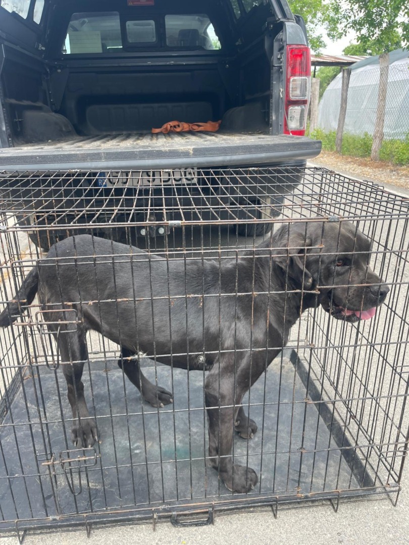 • O femelă Cane Corso, în vârstă de aproximativ 4 ani, de culoare neagră;