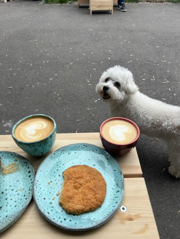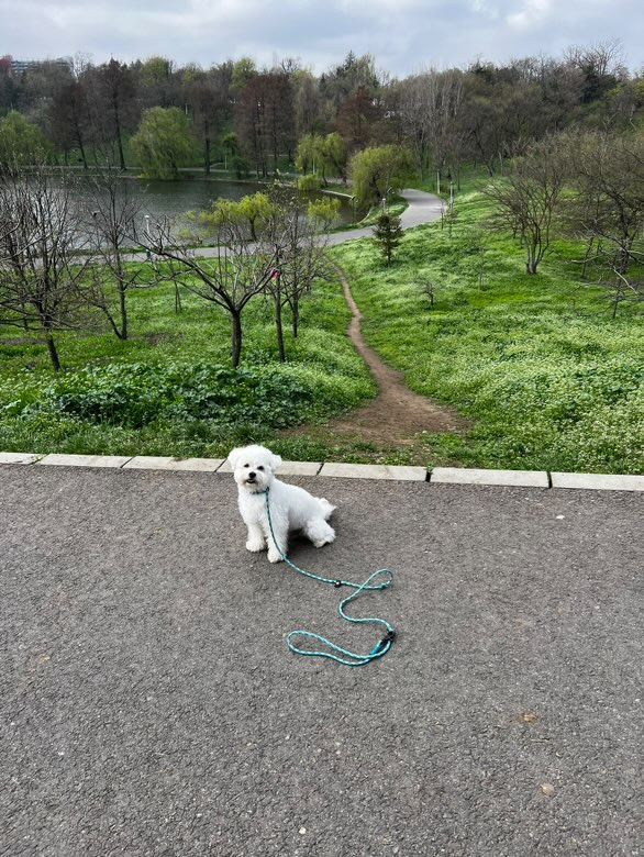 Diana: Noi ieșim de 2 ori pe zi la plimbare și de obicei ne plimbam cam 3-5km/plimbare. Merge în medie 6-7 km pe zi, iar asta îl obosește suficient cât să doarmă toată ziua. Dimineață mergem la cafeluță unde Pini împarte bezele și „face ziua mai bună” angajaților. Cred că asta e partea lui preferată.