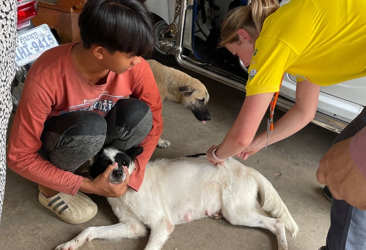 Prima oprire a fost Cambodgia, unde ea și soțul ei, Andrew, au făcut voluntariat în octombrie. Scopul, spune cuplul, este de a imuniza 70% din populația locală de câini, ceea ce ar trebui să rupă ciclul transmiterii de rabie.
