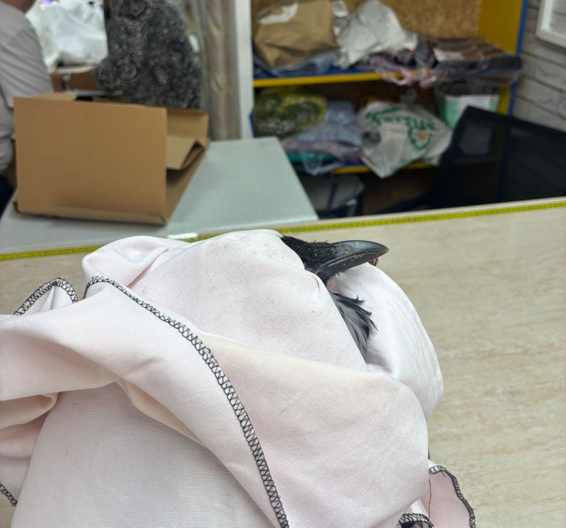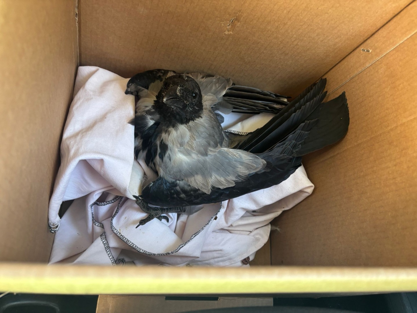 Mihaela Popescu, croitoreasă de peste 10 ani, a văzut pasărea chiar în fața atelierului său. Cioara grivă încerca să traverseze carosabilul și risca să fie lovită de o mașină. Mihaela a atras atenția șoferului și a reușit să o prindă, așezând-o într-o cutie, pe o păturică.