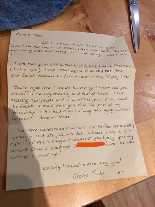 Răspunsul a venit imediat, iar astfel au aflat mai multe despre câinele care îi vizita zilnic. „Dragii mei băieți, ce bucurie a fost să primesc scrisoarea voastră! Am doi ani și patru luni… Vin inițial din Cipru, dar Chris și Sarah m-au salvat dintr-o cușcă din ‘hotelul pentru căței’!” Biletul a fost semnat cu numele cățelușei, Stevie, și cu amprenta lăbuței.