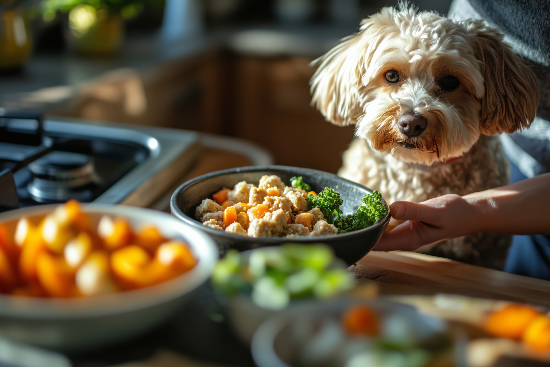 Un câine stă în fața unor boluri cu legume așezate lângă aragaz Sursa foto: Ala Skazava | Dreamstime.com