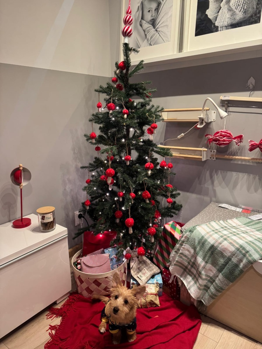 Bucuria Crăciunului este și mai mare cu un cățel vesel alergând pe lângă brad, iar Cristina a povestit că Pike are hăinuțe festive.