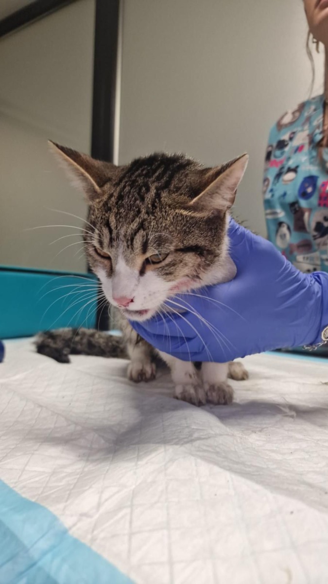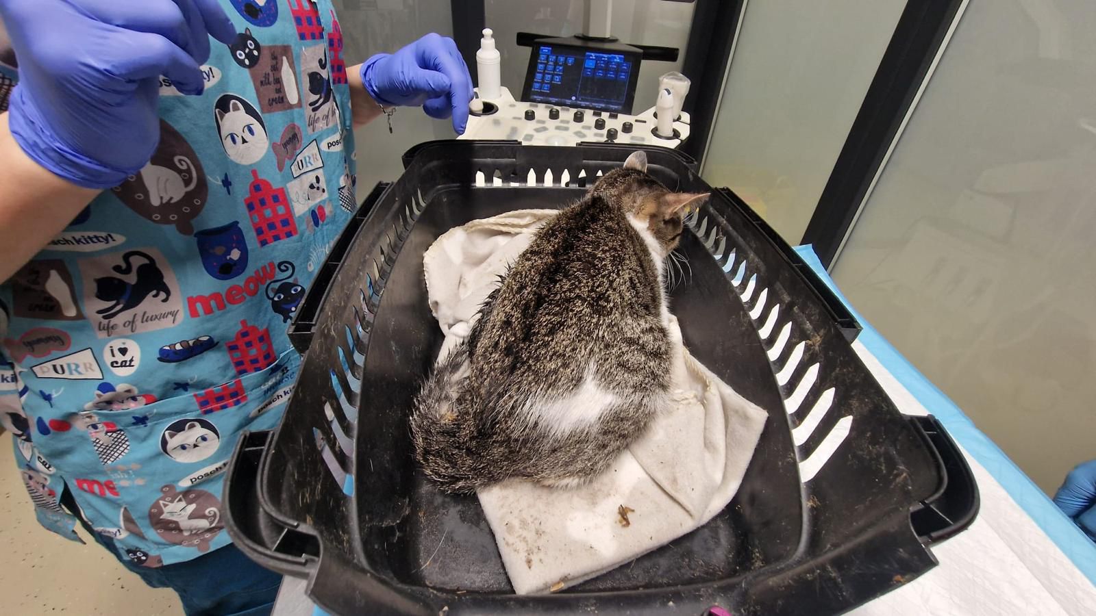 Pisica, aflată într-o stare critică, a fost preluată imediat de polițiști și transportată la o clinică veterinară a unei asociații de profil, unde a primit asistență medicală de urgență. Medicii veterinari au constatat că animalul prezenta șoc traumatic, șoc hipotermic, leziuni hemoragice la nivelul aparatului bucal și o eventrație la flancul abdominal drept.