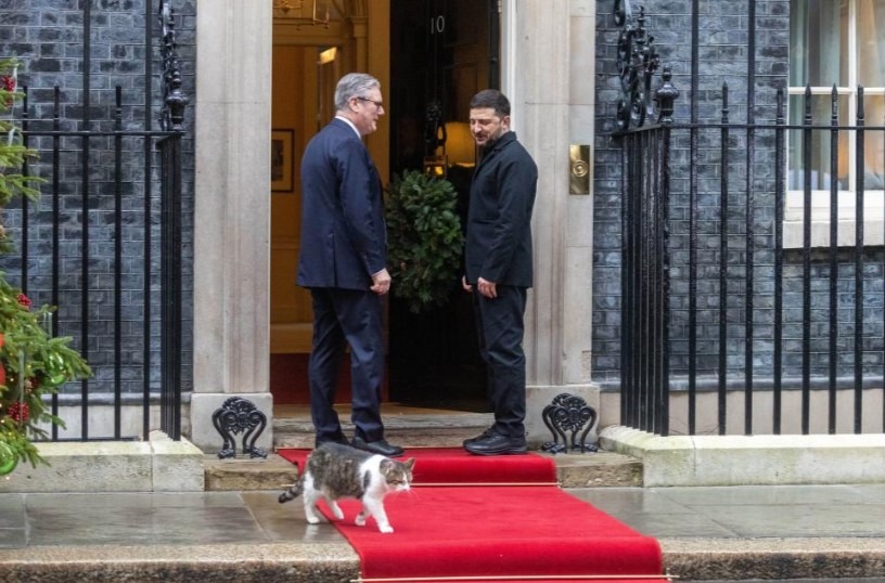 Liderul de la Kiev a fost întâmpinat de premierul britanic Keir Starmer cu o strângere de mână și o îmbrățișare călduroasă. În timp ce intrau, Volodimir Zelenski a făcut o remarcă despre Larry, motanul care aștepta în fața ușii reședinței oficiale.