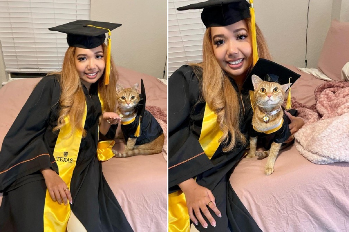 Studenta a publicat pe rețelele sociale fotografii emoționante cu ea și Suki, amândouă îmbrăcate pentru ceremonia de absolvire. În descrierea postării, ea a scris: „Pisica mea a participat la fiecare curs pe zoom pe care l-am avut, așa că AMÂNDOUĂ vom absolvi Universitatea din Texas, Austin”.