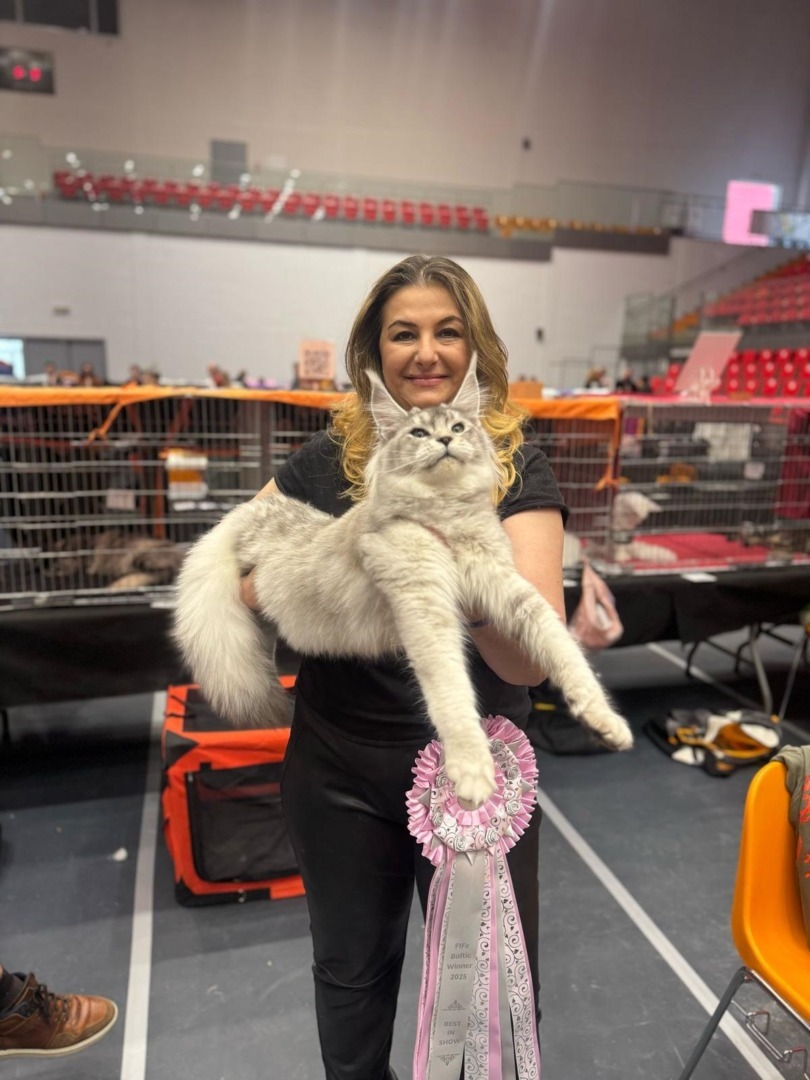 Iara, pisicuță Maine Coon Silver, crescută de Gina Vlad, crescătoare care a obținut rezultate remarcabile, având 3 pisici finaliste ale Campionatul Mondial din 2024 desfășurat în Norvegia.