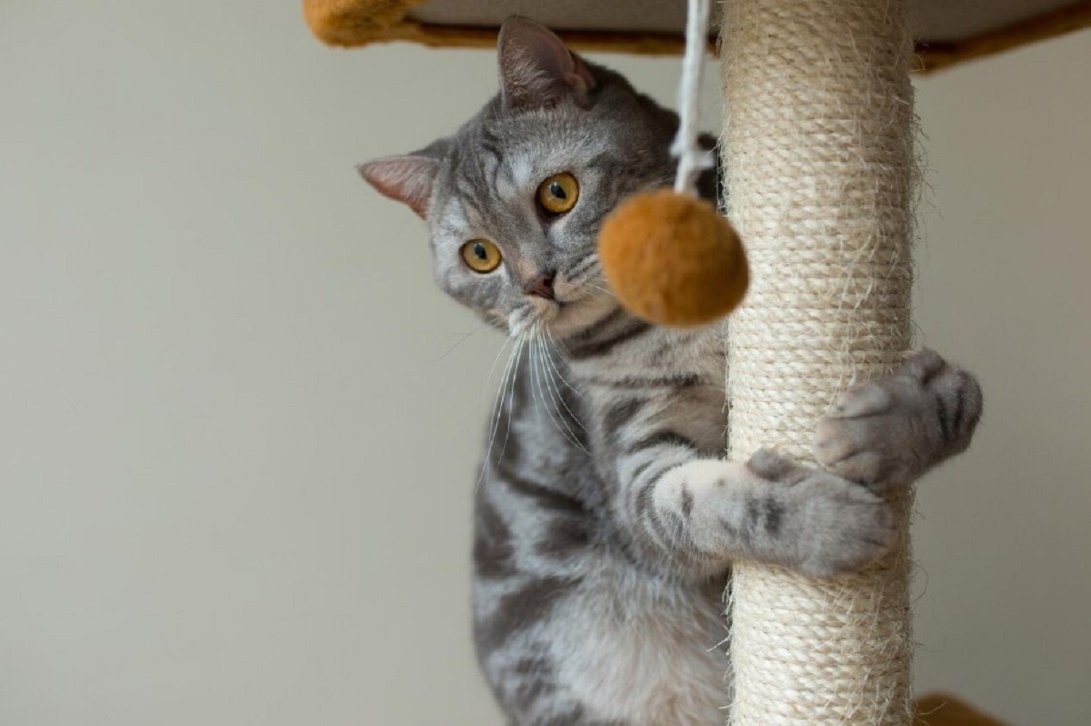 Folosește un stâlp pentru pisici și așază o recompensă în vârf. Odată ce pisica ajunge acolo, pune următoarea la bază. Repetă acest joc de urcat și coborât de 10-15 ori. Este un antrenament complet pentru o pisică sedentară.