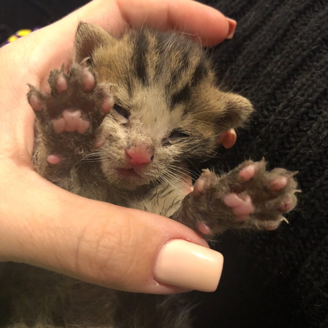 Micuțul, încă prins de cordonul ombilical, abia mai respira. Speriat, Ben a sunat-o imediat pe Dawn, care a fugit într-un suflet la fața locului, a luat pisoiul rece și fără vlagă, l-a băgat sub tricou și s-a rugat să reziste până acasă, notează Animals Around The Globe.
