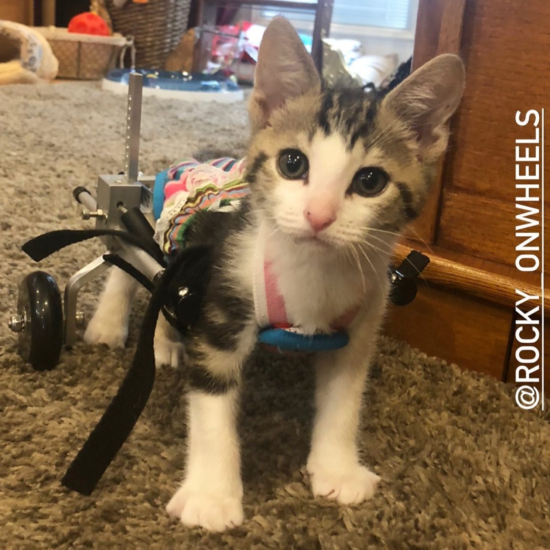 Motanul paralizat Rocky, în cărucior. Sursa foto: Facebook / Rocky_onwheels