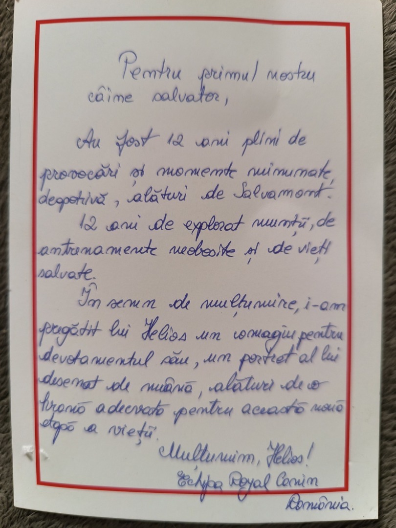 Gestul vine din partea echipei Royal Canin, care a transmis un mesaj de recunoștință pentru Helios, devenit un simbol al devotamentului și curajului pe traseele montane:
