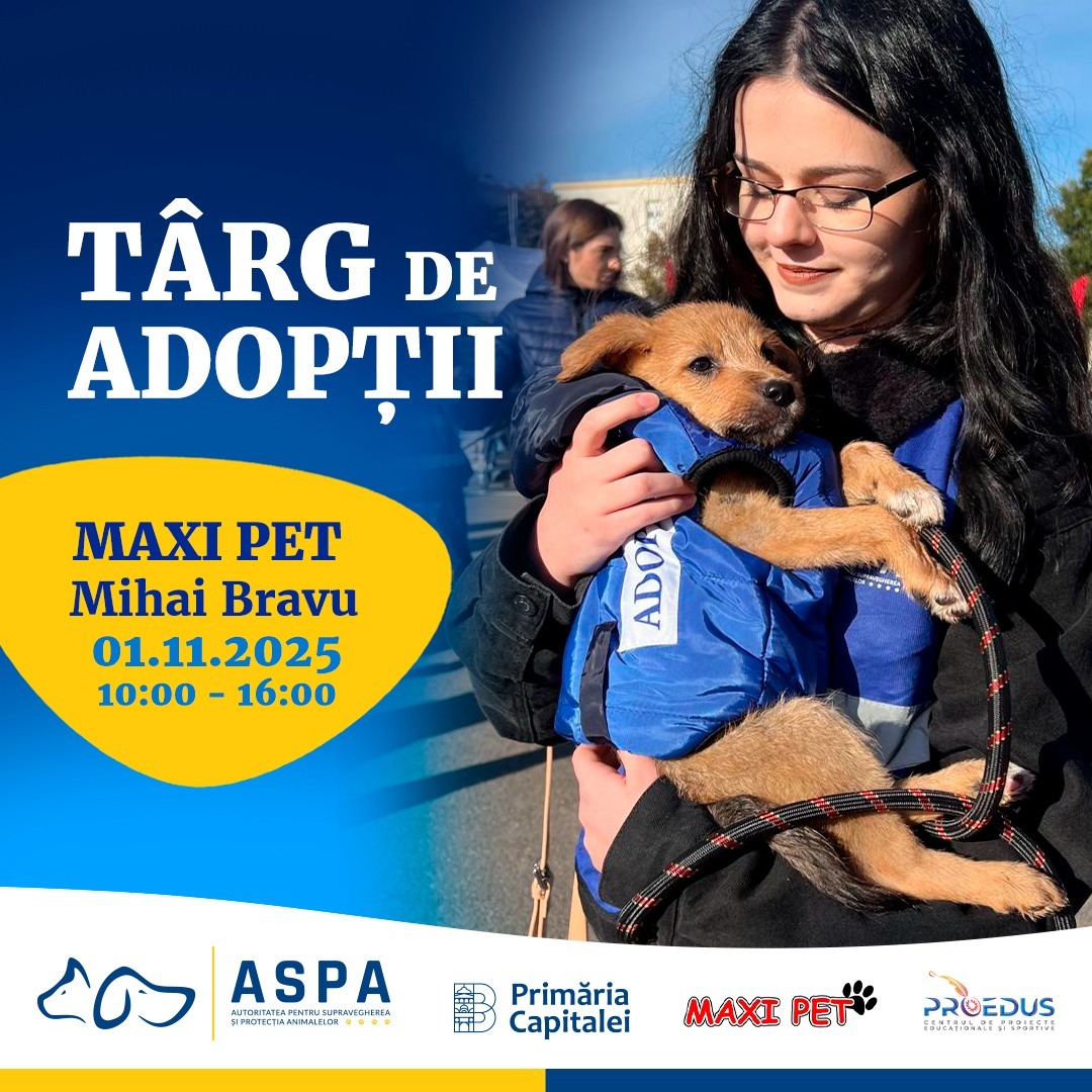 ASPA București organizează sâmbătă, 1 noiembrie, primul târg de adopții indoor din această toamnă. Evenimentul va avea loc la Maxi Pet Mihai Bravu, între orele 10:00 și 16:00.