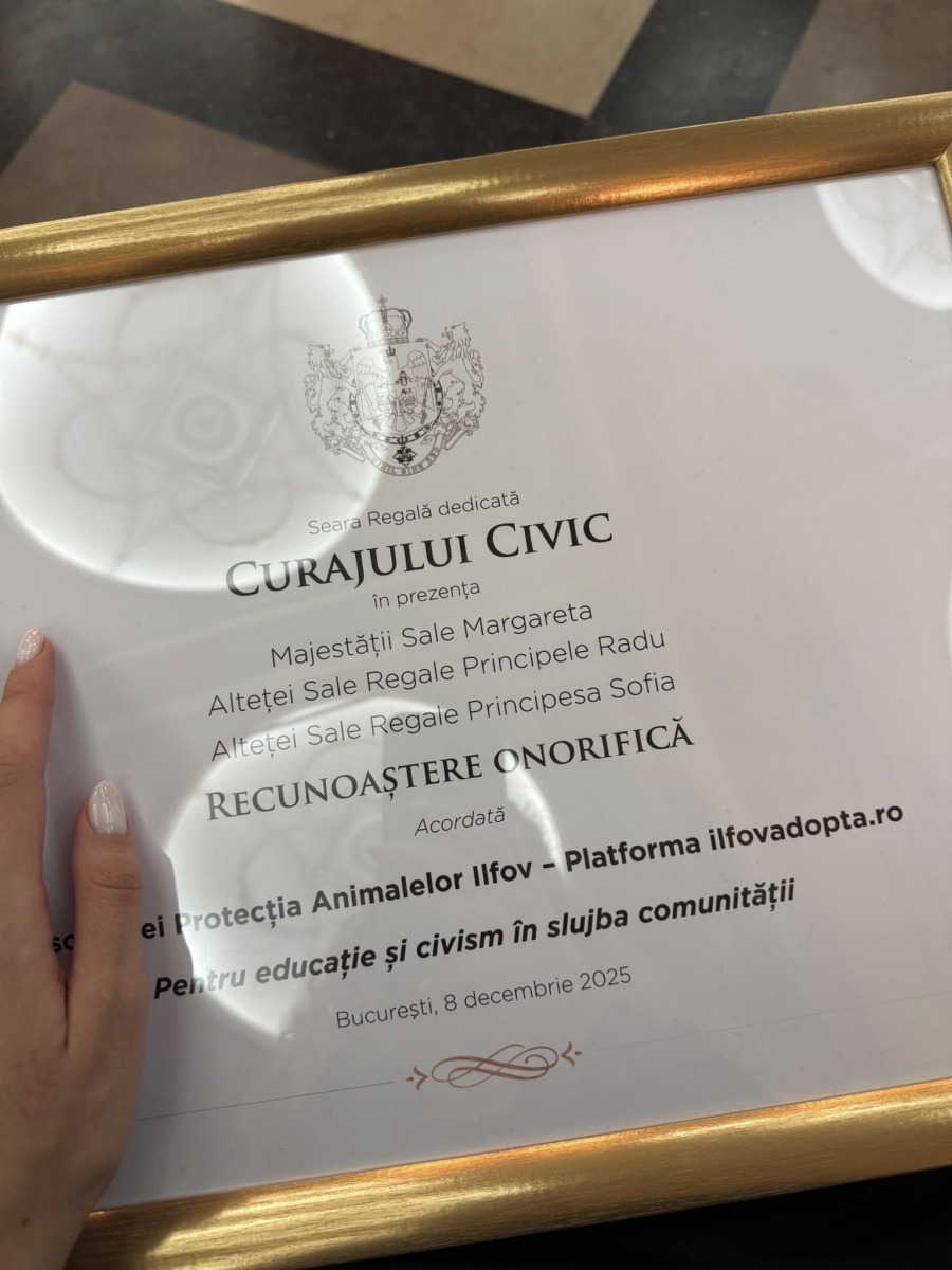 Printre cei care au primit diplome onorifice din partea Majestății Sale, Custodele Coroanei, Principesa Margareta, a Principelui Radu și a Principesei Sofia s-au numărat și reprezentanții Protecției Animalelor Ilfov, care au fost recompensați pentru activitatea desfășurată în ultima perioadă în școlile din județ cu scopul de a-i educa pe elevi în relația lor cu animalele și proiectele nenumărate care vizează bunăstarea necuvântătoarelor.