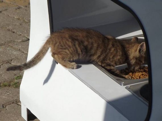 Odată ce bidonul este introdus în automat, o cantitate mare de hrană uscată este distribuită în bolurile pentru animale de companie. Are inclusiv apă pentru câini și pisici. Cea mai interesantă parte a acestor aparate este că Pugedon a promis guvernului că nu va trebui să plătească pentru ele. Acest lucru i-a dat companiei posibilitatea de a le amplasa oriunde.