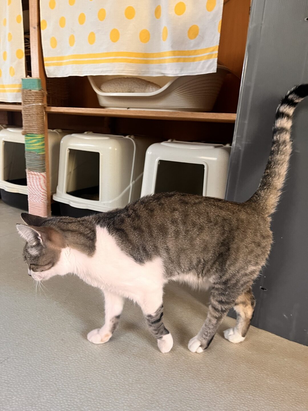 Una dintre cele mai vechi pisici cazate acolo este Glenda. Se învârte în jurul noilor veniți, vrea atenție și începe să toarcă. Nu va pleca niciodată de la Urme de Bucurie, Glenda fiind bolnavă și având nevoie de tratament. Totuși, își face treaba în Casa Pisicilor, primind pe noile venite și facilitând acomodarea acestora. Ai zice că este managerul locației. Undeva sus, de unde se vede și lumea mai bine, un motan negru mustăcește, dar ne lasă să-l fotografiem, doar pentru că știe că aparatele foto au fost create pentru el. Casa Pisicilor are în față o curte și un loc de joacă amenajat; gardul este înalt de 2 metri și jumătate și are un dispozitiv special care le împiedică pe doritoare să plece la plimbare. La intrare, dar și la ieșire, este obligatorie dezinfectarea încălțămintei.