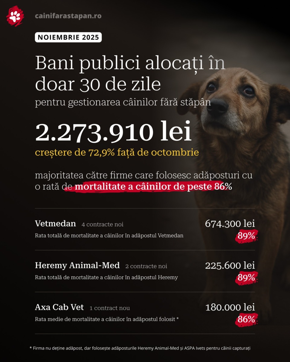 Doar luna trecută, s-au alocat aproximativ 500 000 euro la nivel național, pentru centre cu rată de mortalitate de aproape 90%, conform cainifarastapan.ro. Impactul economic, moral, psihic, fizic și de mediu al acestei probleme nu mai este tolerabil. Vă reamintim că nu există nicio reglementare legată de cât se poate captura și ucide, la ce preț, câte cadavre se pot arde, ce impact de mediu și asupra sănătății are logistica acestui mecanism, precum și multe alte detalii absurde care contrazic alte legi în vigoare.