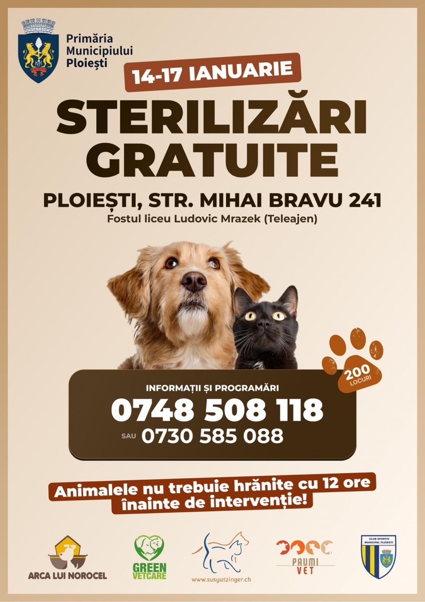 Primăria Ploiești, în parteneriat cu Asociația Arca lui Norocel și CSM Ploiești, organizează prima campanie gratuită de sterilizare a câinilor și pisicilor din acest an. Acțiunea se va desfășura între 14 și 17 ianuarie, la fostul Liceu „Ludovic Mrazek”, str. Mihai Bravu nr. 241.