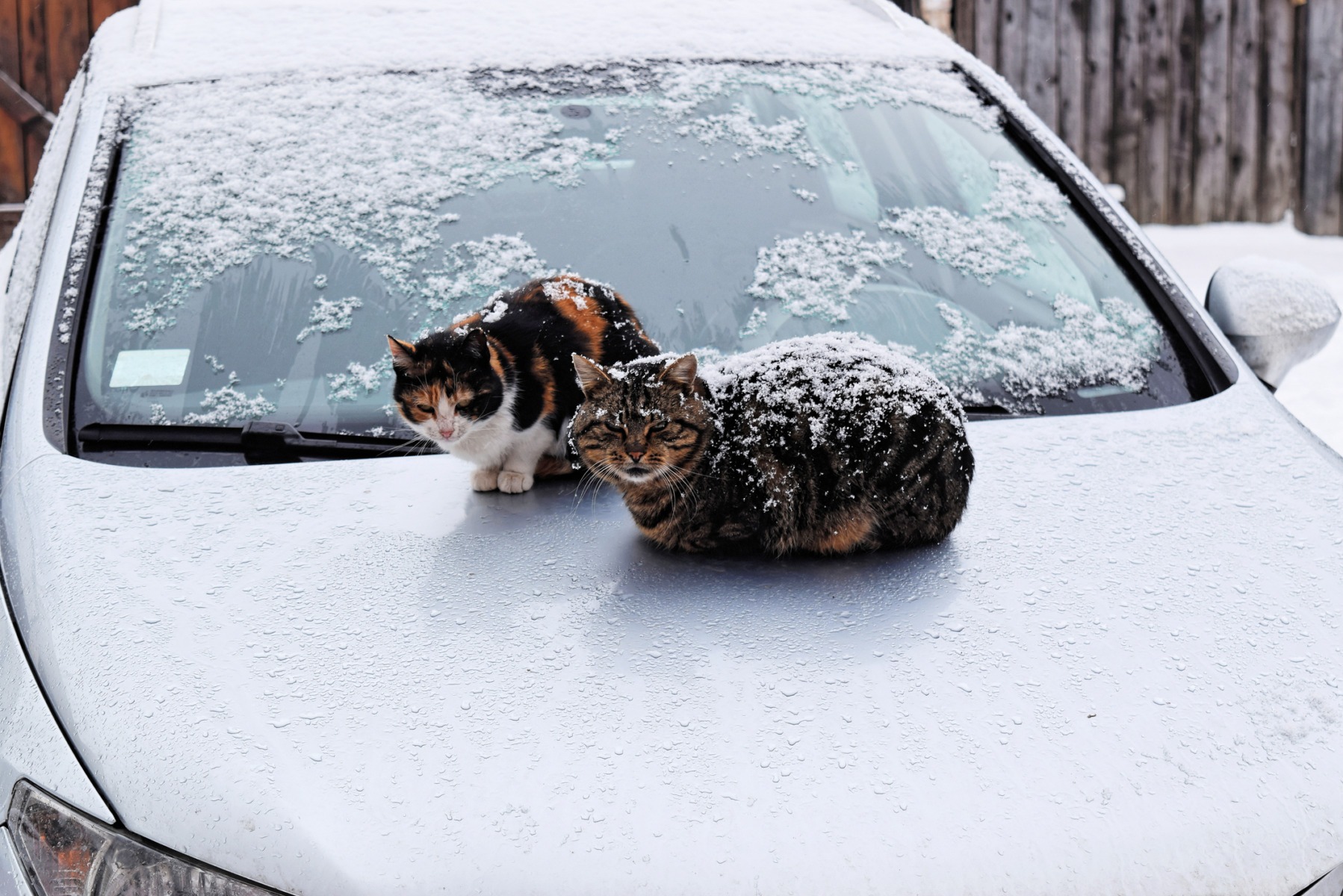 Două pisici stau pe capota unei mașini, iarna Sursa foto: Zvonko59 | Dreamstime.com