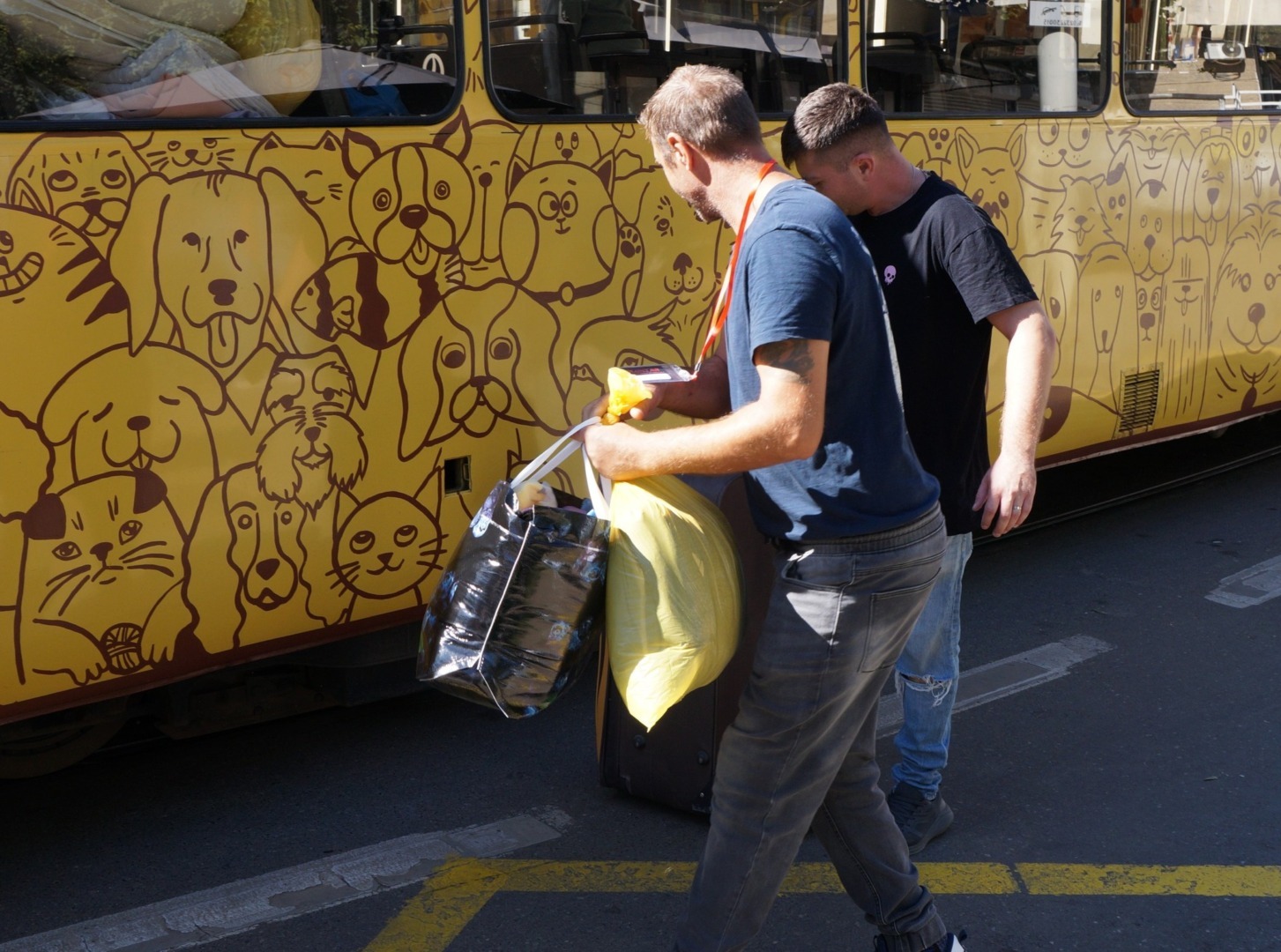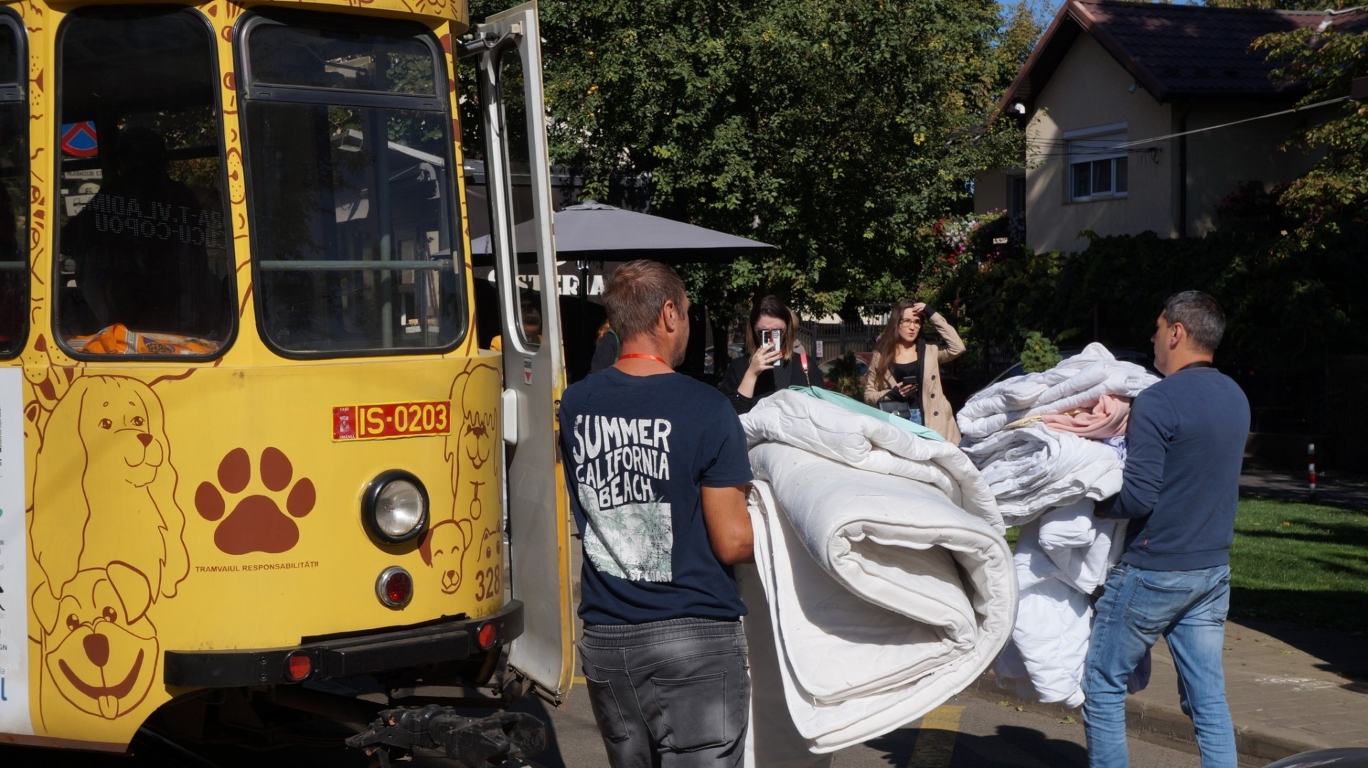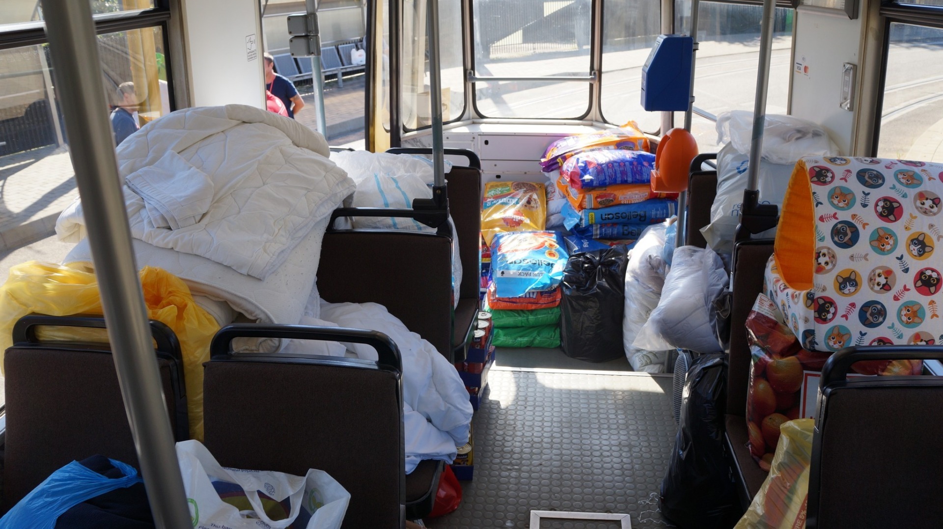 Sacii cu mâncare, conservele și recompensele au fost aduse de donatori în stațiile tramvaiului pe care sunt pictați câini și pisici și care străbate orașul.