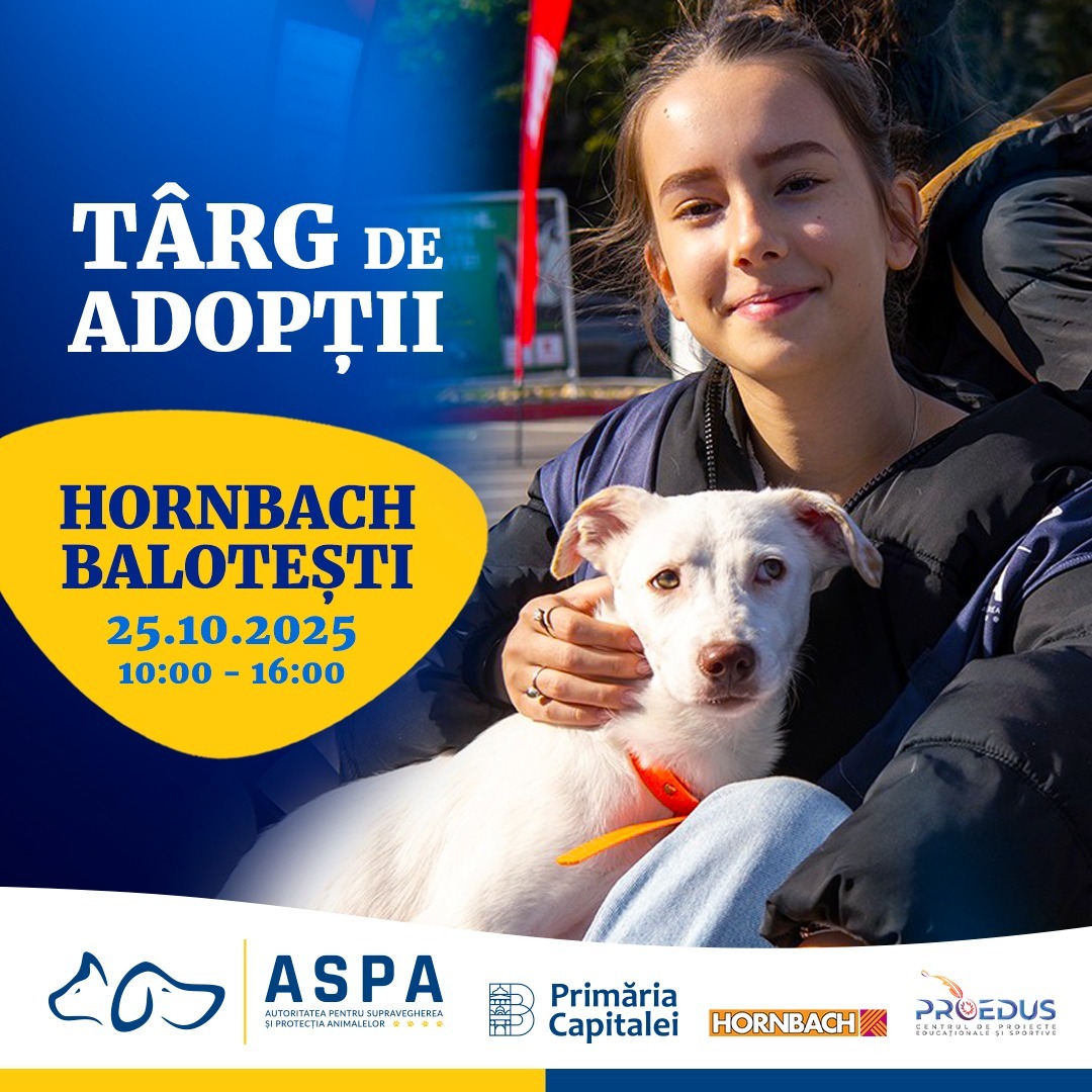 Sâmbătă, 25 octombrie, între orele 10:00 și 16:00, pe Calea București 2A, în parcarea Hornbach Balotești, vei putea întâlni 25 de câini pregătiți să-și găsească o familie iubitoare.