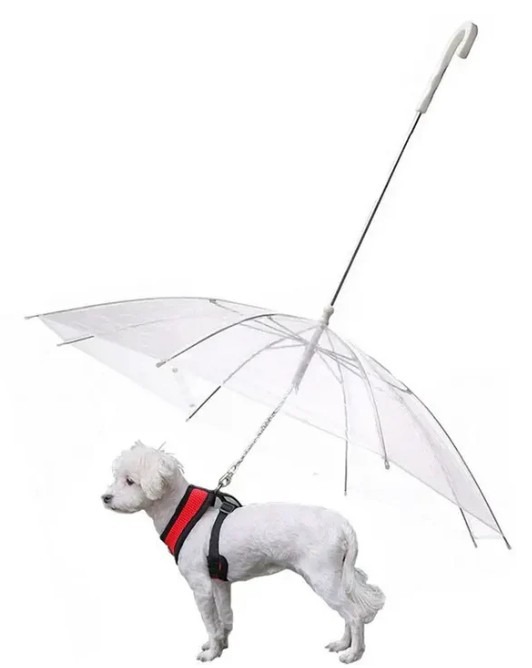 Umbrela transparentă pentru animale de companie e soluția ideală pentru stăpânii care nu lasă vremea să le strice rutina. E elegantă, practică și ușor de folosit — plus că arată adorabil în poze!